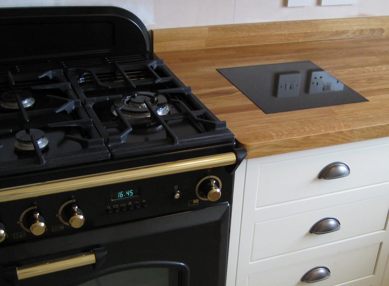 Granite tile integrated into the worktop. Used as a hot pan plate.